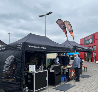 Ständen auf der Außenfläche präsentiert. Fiskars war zum Beispiel mit dabei, aber auch Rösle, Napoleon, Merklinger, Ofyr und andere mehr, dazu noch zahlreiche Anbieter aus dem Foodbereich. Die alle übrigens nur Veganes offerierten. Dazu kamen noch viele Aktionen im Innenbereich des Fachmarktes, der neben dem Grilldorado auch ein Geschäft für Elektrogroß- und kleingeräte beherbergt.