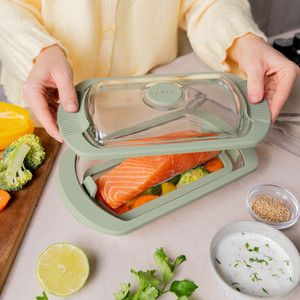 Das Highlight der neuen Produktreihe ist der neue Glas-Dampfgarer aus Borosilikatglas, einem hochwertigen Material, das für seine Hitzebeständigkeit und Langlebigkeit bekannt ist. Durch das Glas behält man den Garvorgang im Blick, das Timing wird einfacher, das Gefäß kann direkt aus dem Backofen oder der Mikrowelle auf den Tisch gestellt und die Reste anschließend im Kühlschrank aufbewahrt werden. Der Glas-Dampfgarer ist sowohl für die Mikrowelle als auch für den Backofen geeignet. Dank der Silikongriffe lässt er sich direkt nach dem Erhitzen sicher und einfach vom Ofen auf den Tisch tragen. Auch das von Lékué gewählte Design steht ganz im Zeichen der Vereinfachung: ein einziges Gefäß, das zum Kochen, Servieren und Aufbewahren dient und überflüssiges Geschirr und zusätzliche Vorbereitungsschritte erspart. Dank der Ablage können zudem zwei Zutaten gleichzeitig zubereitet werden, was Geschmack und Aroma verstärkt.