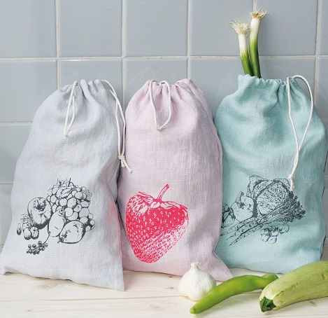Unser aktueller Favorit sind die Beutel aus 100% Leinen. Die nimmt man mit in den Supermarkt und packt Äpfel, Karotten und anderes rein. Spart Plastik. Und belüftet die Lebensmittel optimal, so bleiben sie länger frisch. Die Leinenbeutel lassen sich von oben mit einer Zugkordel verschließen, es gibt sie in verschiedenen Designs.